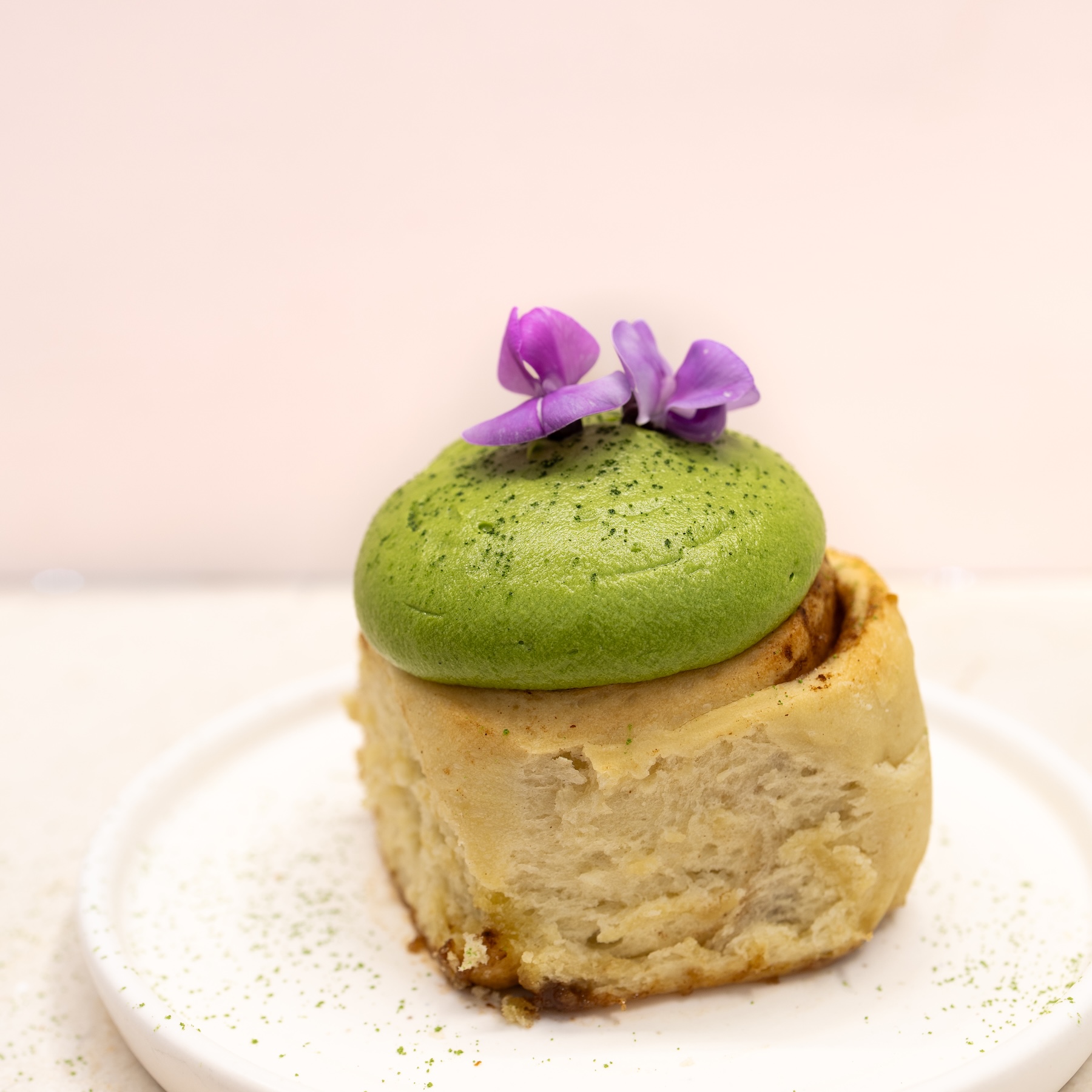 Our fluffy vegan cinnamon swirl topped with ceremonial grade vegan matcha cream cheese glaze.