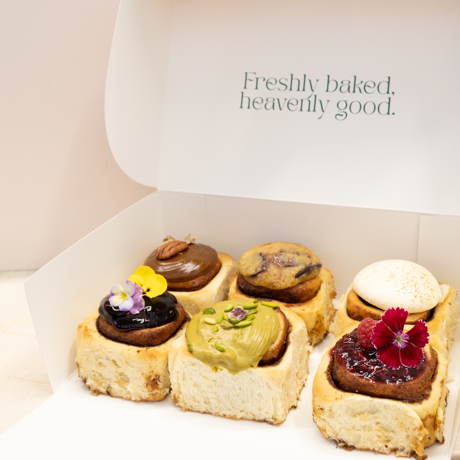 Our fluffy classic cinnamon swirl topped with homemade pistachio cream & fresh crushed pistachios.